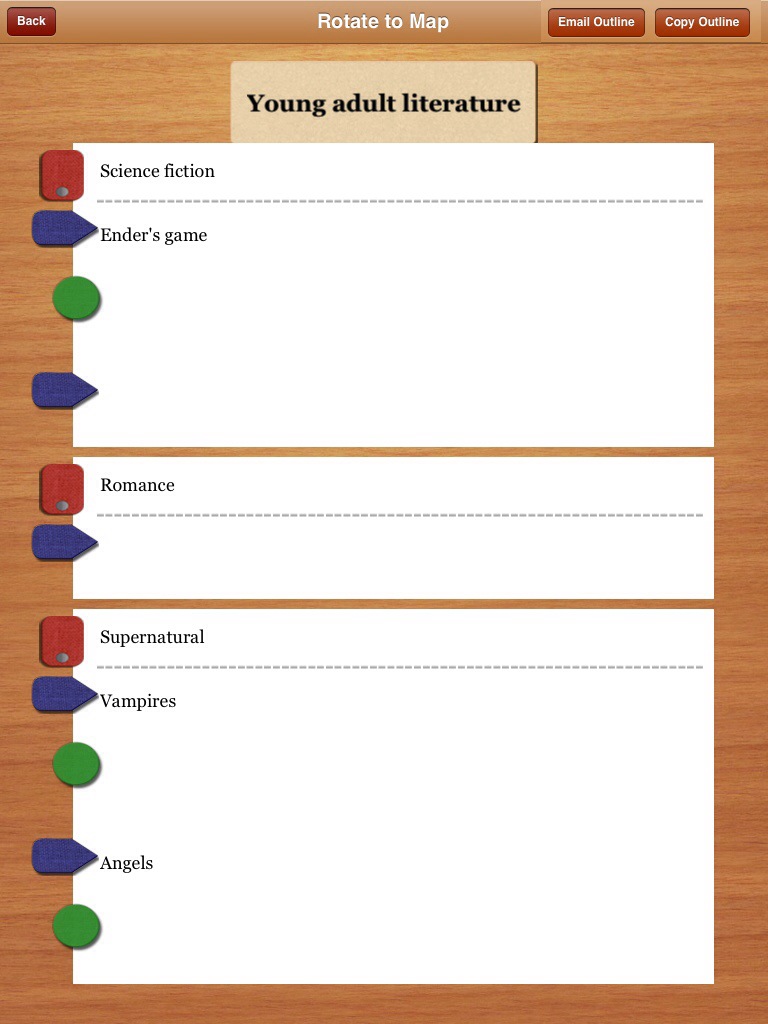 it gives you a more textual outline, more like you would write on a piece of paper. You can edit it in either form, which ever works best for you. If you want and have e-mail set up on your iPad, you can send it to someone (like, perhaps your teacher who required an outline for that paper you’re working on?). The vertical option does have colours, but the horizontal does not – I like popplet better for mapping because of that, but the mindmapping vertical is great for those who like to make lists, not maps.